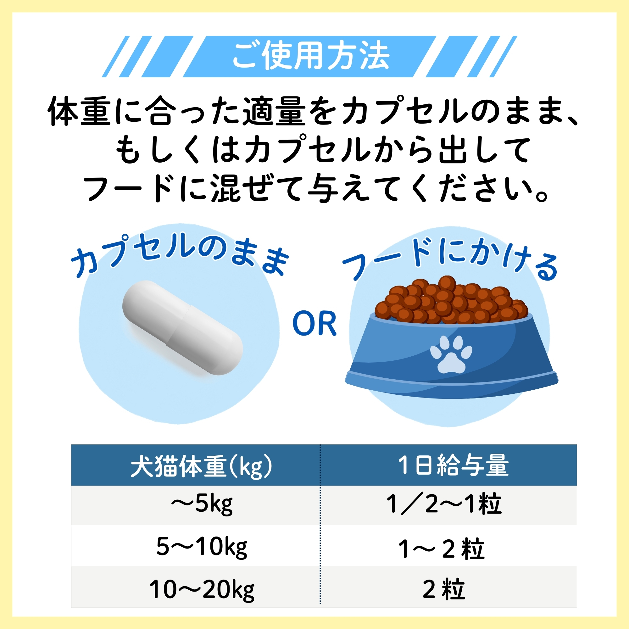 ご使用方法はとても簡単です。愛犬・愛猫の体重に合った適量を目安に与えてください。カプセルのまま与えるか、カプセルから中身(粉末)を取り出して、いつものフードに混ぜて与えることもできます。体重別の1日給与量(例:5kgまでなら1/2~1粒)をご確認いただき、毎日の習慣として手軽に健康サポートを始めてください。