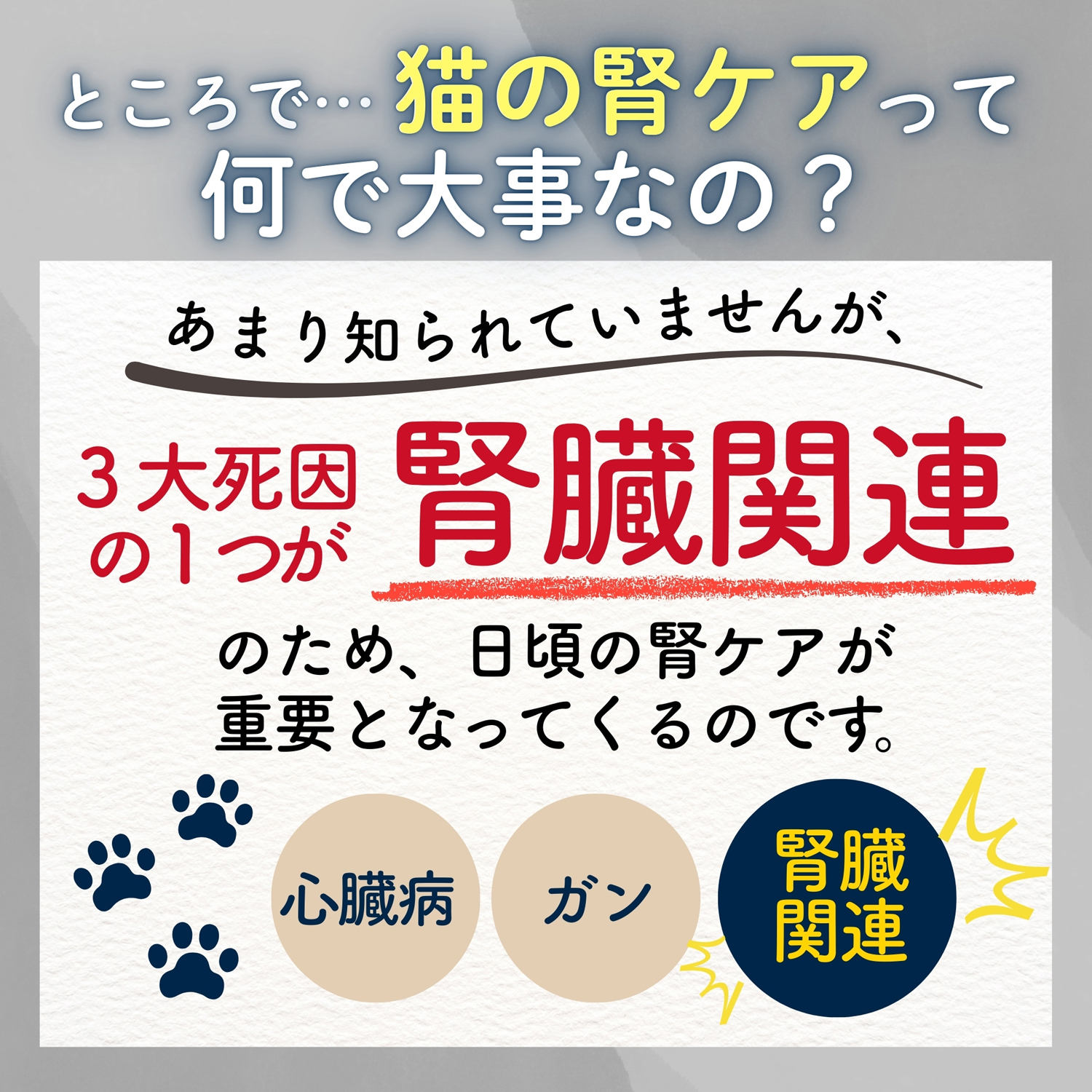 猫の死因トップ3の一つが腎不全です。腎臓の機能が低下すると、体内の老廃物がうまく排出できなくなり、体に負担がかかってしまいます。